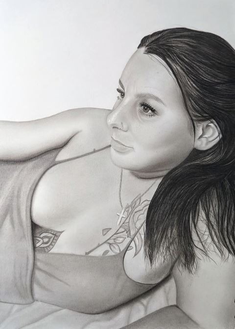 Dans "Amour avec passion", Élodie immortalise l'essence de la tendresse et de la sensualité à travers le portrait délicat d'une jeune femme aux longs cheveux noirs. Dessinée en noir et blanc, avec un jeu subtil de fusain et de crayon, elle émane une beauté douce et sereine. Son regard profond et son sourire léger captivent, évoquant une passion contenue, empreinte de grâce. Chaque trait, tracé avec soin, raconte une histoire d'amour et de complicité. Par son art, Élodie saisit cette expression naturelle et vibrante, où se mêlent amour, mystère et douceur éternelle.