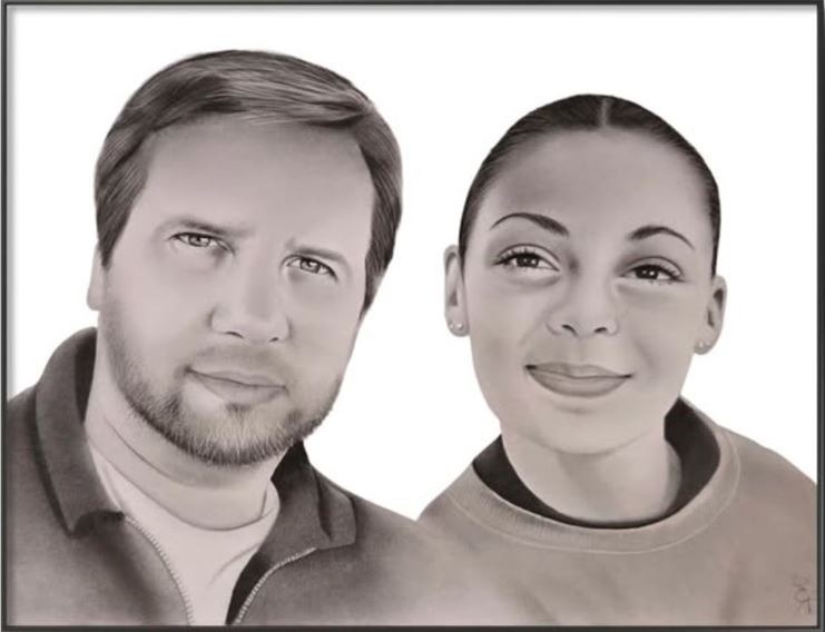 Ce portrait au fusain représente un moment de tendresse entre un père et sa fille, capturé avec une grande sensibilité. Réalisé en noir et blanc, il évoque une atmosphère intemporelle et pleine d’émotion. Les visages ont été volontairement rapprochés, un choix artistique afin de souligner la force du lien qui unit ces deux êtres. Le fusain, avec ses nuances subtiles de gris et de noir, apporte texture, contraste et douceur, tout en accentuant les regards, les expressions, et cette proximité précieuse qui se dégage du portrait.