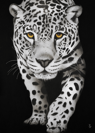 Sur une toile au fond noir profond, un jaguar se détache avec une intensité saisissante. Ses contours, dessinés avec soin, ressortent vivement sur cet arrière-plan sombre, créant une présence presque vivante. Elodie a travaillé chaque détail du pelage. Les yeux du jaguar, peints d'un jaune perçant ou d'un marron lumineux, accrochent immédiatement le regard. Son corps musclé est subtilement ombré pour suggérer sa puissance et son agilité, tout en restant en partie dissimulé dans les ténèbres, comme si le jaguar faisait un pas hors de la nuit. Le jaguar semble à la fois proche et insaisissable, une silhouette majestueuse qui émerge du néant pour captiver le regard et imposer le respect.