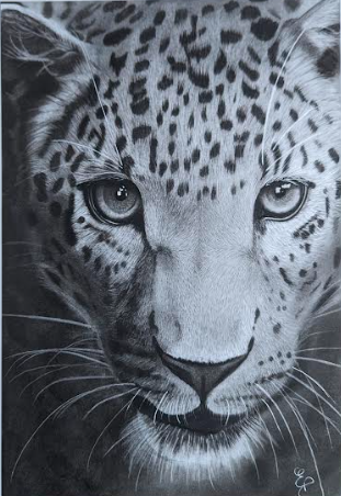Le portrait "La puissance du regard", réalisé avec une finesse remarquable au fusain, capte immédiatement l’attention par son regard perçant et saisissant. Les yeux du félin semblent traverser la toile, transmettant une intensité qui évoque à la fois la force et la sagesse ancestrale. Chaque détail du pelage, magnifiquement texturé, joue avec la lumière et l’ombre, créant un effet de profondeur qui donne vie à l'image. Le contraste entre les taches sombres et les nuances du pelage met en avant la majesté de cet animal sauvage, tandis que l'expression de son visage, à la fois calme et alerte, invite à la contemplation.