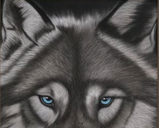 Réalisé au fusain, ce portrait de loup révèle toute la majesté et la puissance silencieuse de cet animal mythique. Chaque trait noir sur blanc dessine avec précision la texture du pelage, la finesse des contours, et la profondeur de son expression. Le fusain, matière brute et expressive, épouse parfaitement l’âme sauvage du sujet, tout en laissant respirer les nuances de lumière et d’ombre. Mais c’est dans le regard que réside toute la singularité de cette œuvre : un bleu métallique, presque irréel, vient trancher avec la monochromie du dessin. Ce reflet vibrant capte l’œil, comme un éclat d’âme figé dans l’instant. Il évoque la force instinctive, la solitude noble, et la sagesse ancienne du loup.