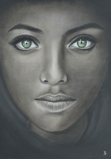 Dans Regard d’Orient, Élodie Pinchon capture la profondeur et la mystique d’un visage dont les yeux verts, lumineux et pénétrants, semblent traverser le temps. Ce portrait, à la fois doux et intense, évoque un équilibre parfait entre sérénité et force intérieure. Les nuances subtiles du noir et du gris mettent en valeur la lumière du regard, véritable point focal de l’œuvre, tandis que la douceur des traits révèle une beauté à la fois universelle et singulière.