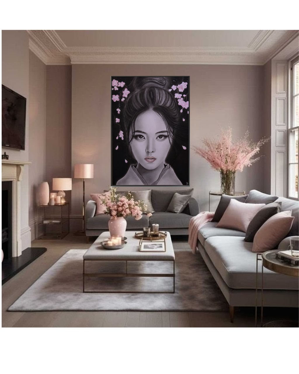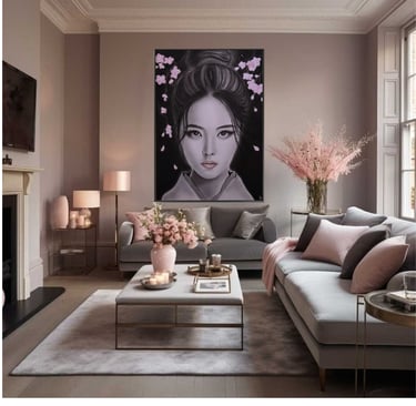 Dans ce portrait, le regard capte immédiatement l’attention. Profond, calme, presque méditatif, il semble traverser le temps. La chevelure, sculptée avec minutie, encadre un visage délicat aux traits précis, presque intemporels. Autour d’elle, les pétales de sakura flottent comme un souffle léger.
