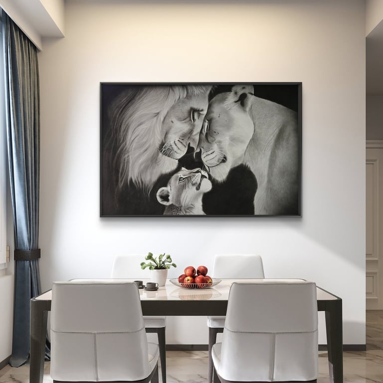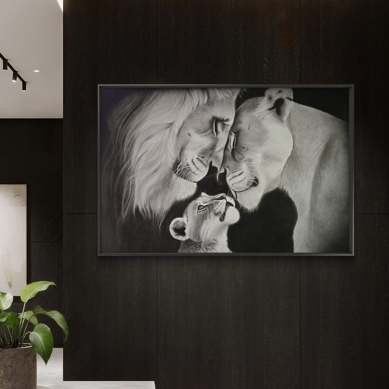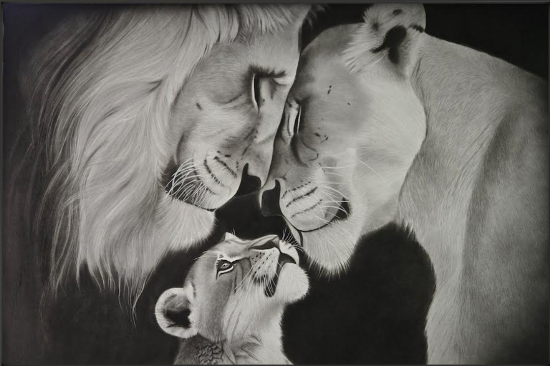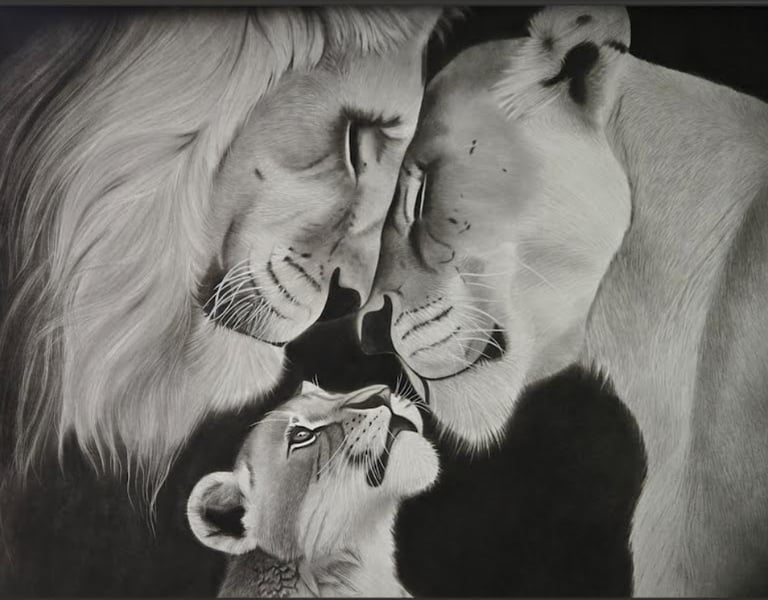 Cette œuvre au fusain représente une famille de lions unie : le lion, la lionne et leur lionceau. Par le jeu des ombres et des contrastes, le fusain souligne la puissance tranquille du lion, la douceur vigilante de la lionne et l’innocence du lionceau blotti entre eux.