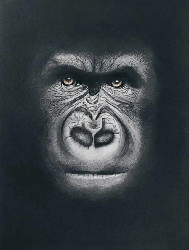 Découvrez l'une des créations les plus captivantes d'Élodie Pinchon, un portrait saisissant intitulé "Sagesse intemporelle". Ce dessin au fusain met en scène un majestueux gorille, dont les yeux brillants et bienveillants capturent immédiatement l'attention et l'âme du ...