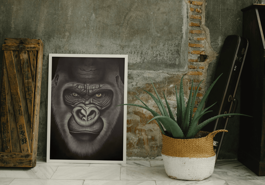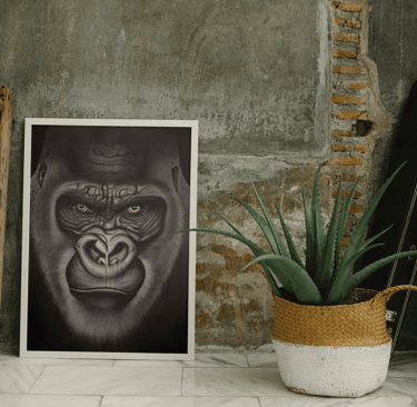 Dans cette œuvre réalisée au fusain, la précision du trait épouse la texture brute d’une matière vivante. Les rides profondes du front, les muscles tendus autour du regard, chaque ligne semble sculptée dans l’obscurité elle-même. Le gorille, monumental et immobile, émerge d’un néant sans repères, comme un totem éveillé dans la nuit.
