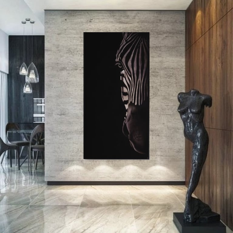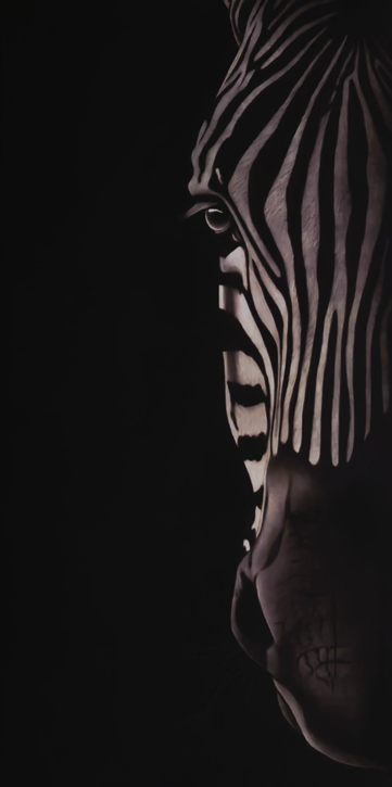 Dans L’ombre des rayures, le zèbre ne se contente pas d’apparaître : il se révèle, lentement, comme façonné par la lumière elle-même. Le fusain sculpte les contrastes avec précision, laissant le noir profond absorber l’espace tandis que les lignes blanches tracent un rythme presque hypnotique.