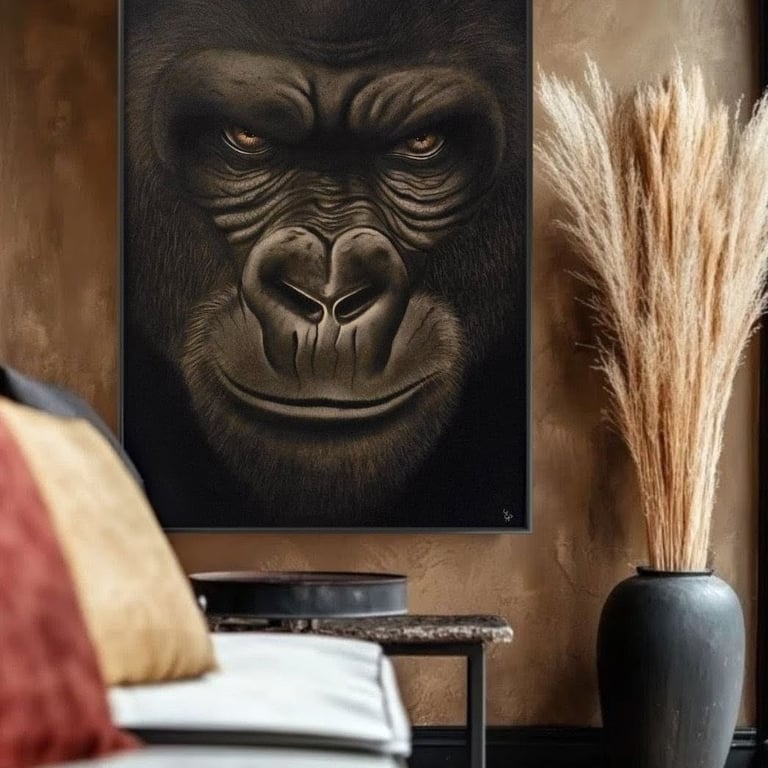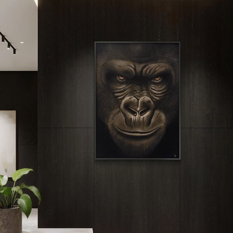 De l’obscurité du fusain surgit un visage puissant, façonné par les ombres et la matière. Le gorille apparaît lentement, comme s’il sortait du silence lui-même. Dans cette profondeur monochrome, seuls ses yeux se parent de couleur, créant un contraste moderne et inattendu. Leur éclat attire le regard et révèle une lueur malicieuse, presque complice. Entre force brute et mystère, l’œuvre joue avec la lumière et l’ombre pour dévoiler une présence à la fois sauvage, intelligente et profondément énigmatique.