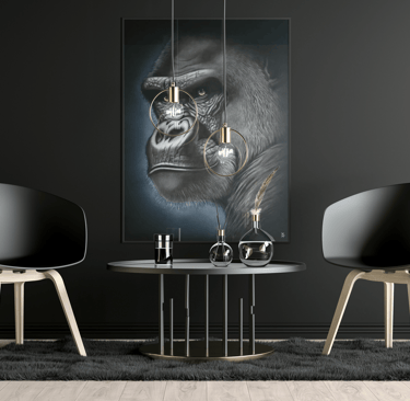 Dès le premier regard, c’est l’ambiance qui capte l’attention : une obscurité calme, presque palpable, teintée de nuances froides où la lumière semble flotter sans jamais tout dévoiler. Ce clair-obscur maîtrisé révèle juste ce qu’il faut du sujet : le museau massif, les arcades proéminentes, les yeux profonds et brillants, sans jamais sortir le gorille de l’ombre. Le crâne disparaît presque entièrement dans la pénombre, concentrant toute la puissance visuelle sur la partie frontale du visage, que l’on perçoit dans toute sa densité expressive.