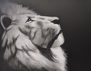 L'œuvre "Majesté nocturne" représente un majestueux lion vu de profil, sa silhouette se détachant dans une obscurité profonde et mystérieuse. La lumière est subtile, mais elle éclaire légèrement le contour de sa tête, mettant en valeur les détails de sa crinière en ombres mouvantes. Ses yeux, fixant un point invisible dans le ciel au-dessus de lui, comme s’il cherchait quelque chose dans l’infini. L’environnement est plongé dans une nuit noire, où seuls les contours du lion prennent vie à travers des ombres douces, créant une ambiance de silence et de puissance. La composition générale de l'œuvre joue sur cette dualité, entre la présence imposante du lion et l'inconnu qui l’entoure.