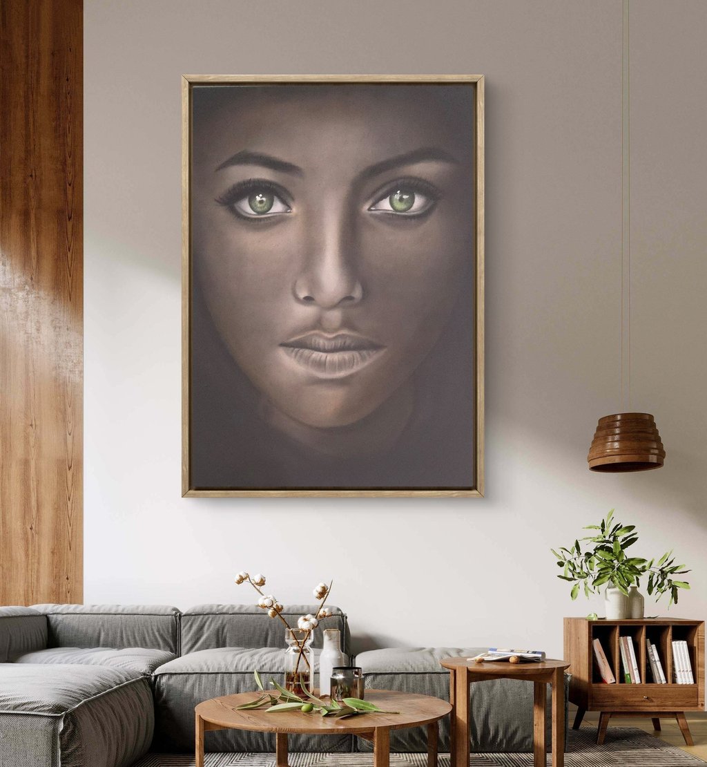 Dès le premier instant, ce sont les yeux qui captivent. Verts, lumineux, presque hypnotiques, ils deviennent le cœur vibrant de l’œuvre. Ils racontent une histoire sans parole, une présence à la fois mystérieuse et apaisante.