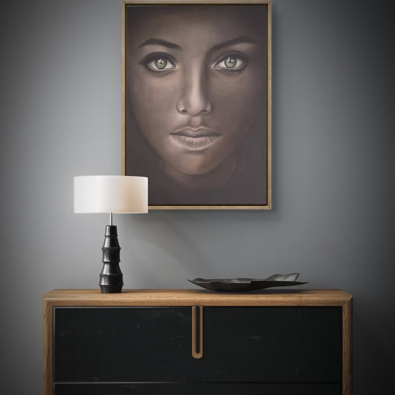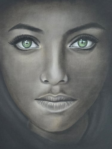 Dans Regard d’Orient, Élodie Pinchon capture la profondeur et la mystique d’un visage dont les yeux verts, lumineux et pénétrants, semblent traverser le temps. Ce portrait, à la fois doux et intense, évoque un équilibre parfait entre sérénité et force intérieure. Les nuances subtiles du noir et du gris mettent en valeur la lumière du regard, véritable point focal de l’œuvre, tandis que la douceur des traits révèle une beauté à la fois universelle et singulière.