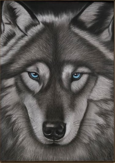 Réalisé au fusain, ce portrait de loup révèle toute la majesté et la puissance silencieuse de cet animal mythique. Chaque trait noir sur blanc dessine avec précision la texture du pelage, la finesse des contours, et la profondeur de son expression. Le fusain, matière brute et expressive, épouse parfaitement l’âme sauvage du sujet, tout en laissant respirer les nuances de lumière et d’ombre. Mais c’est dans le regard que réside toute la singularité de cette œuvre : un bleu métallique, presque irréel, vient trancher avec la monochromie du ...