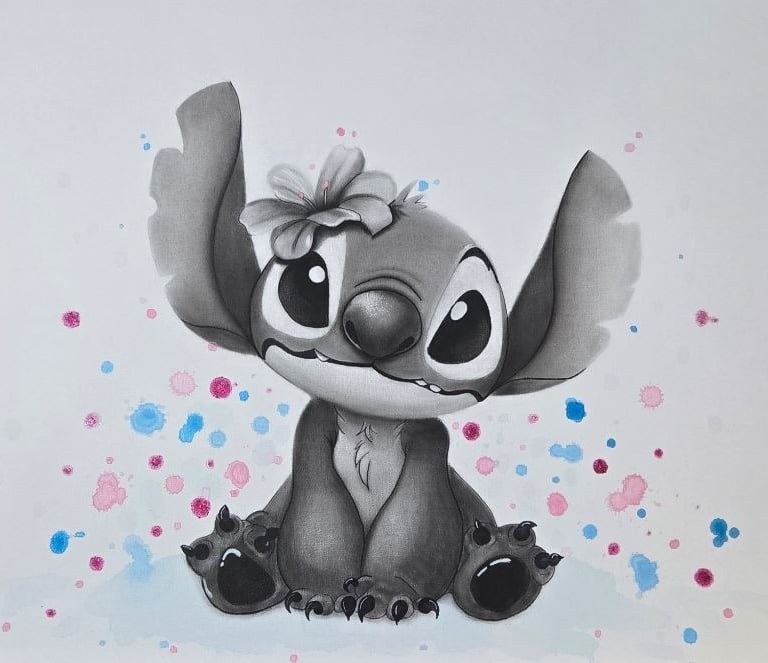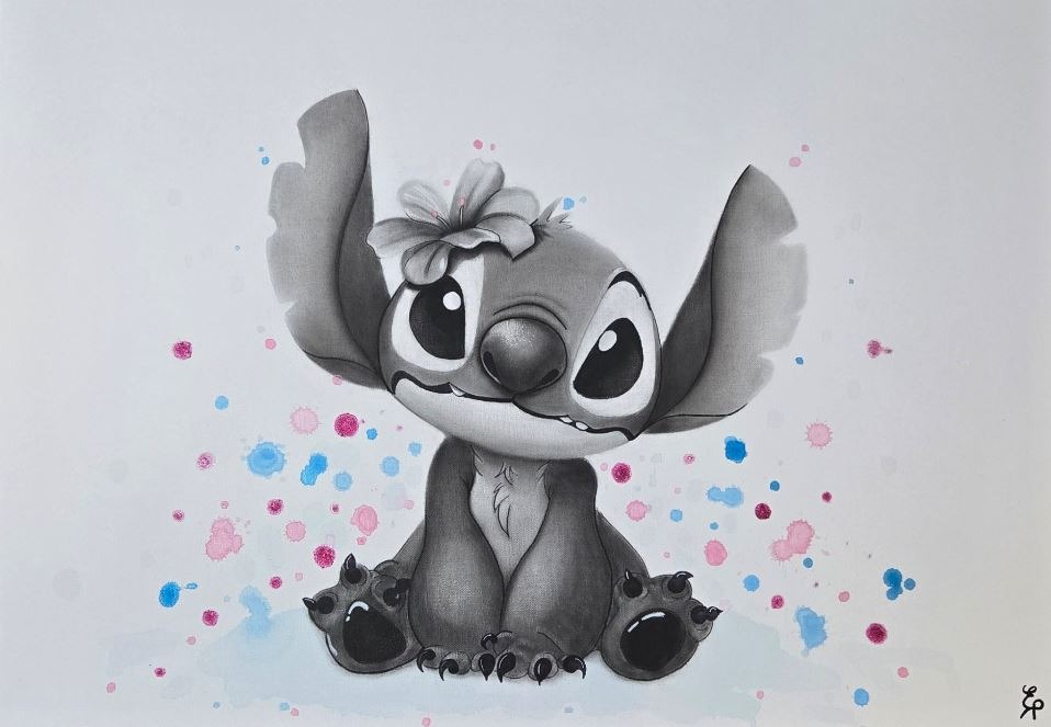 Réalisée au fusain et sublimée par des touches d’aquarelle, cette œuvre met en scène une version attendrissante et poétique de Stitch, personnage emblématique de l’univers Disney.