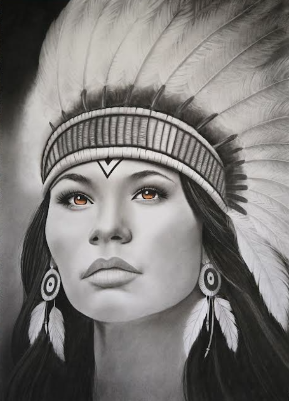 Dans le velours de l’ombre, elle apparaît doucement, comme un souffle ancien ramené par le vent. Le fusain trace avec grâce les courbes de son visage, sculpté par le temps et l’esprit de la terre. C’est une femme amérindienne, aux yeux marron clair, profonds comme les rivières calmes au lever du jour. Sa coiffe de plumes danse silencieusement autour de son visage, écho des grands espaces et des légendes oubliées. Elle regarde l’horizon avec une sérénité presque céleste, comme si elle devinait les secrets du monde au-delà des montagnes. Son regard invite à l’évasion vers les plaines infinies, les forêts sacrées, les cieux rouges du couchant. Une présence paisible, ancrée dans l’âme des terres, qui murmure à celui qui la contemple : « pars à la rencontre du vent, il te montrera le chemin ».
